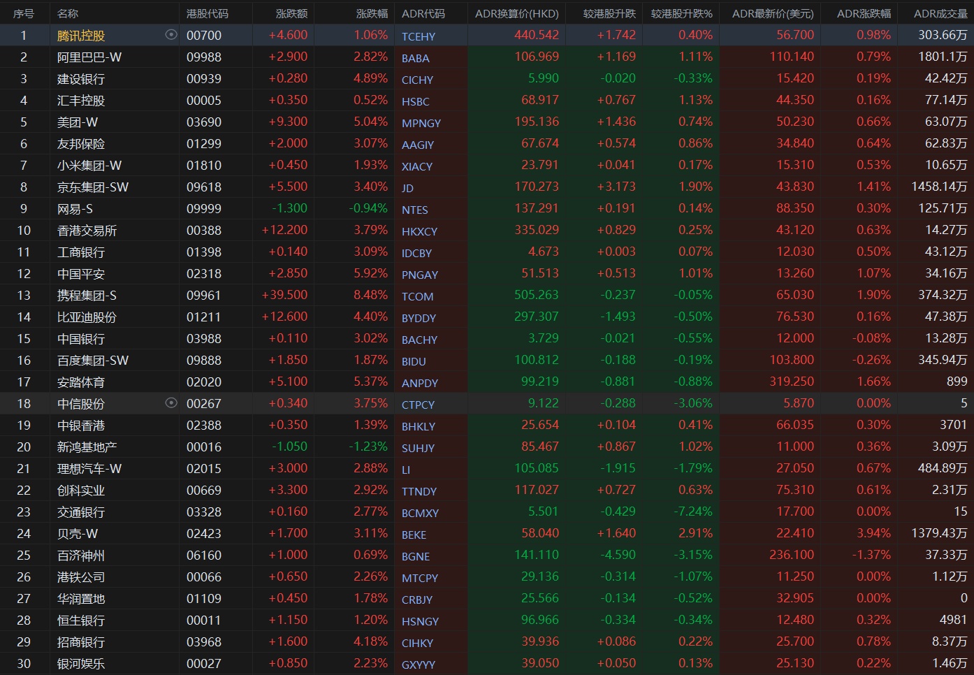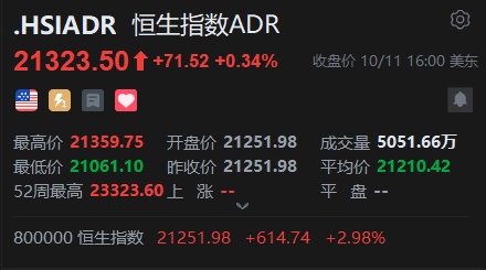 智通财经APP获悉,周五美股三大指数集体上涨,恒生指数ADR上涨,按比例计算,收报21323.50点,较香港收市上涨71.52点或0.34%。