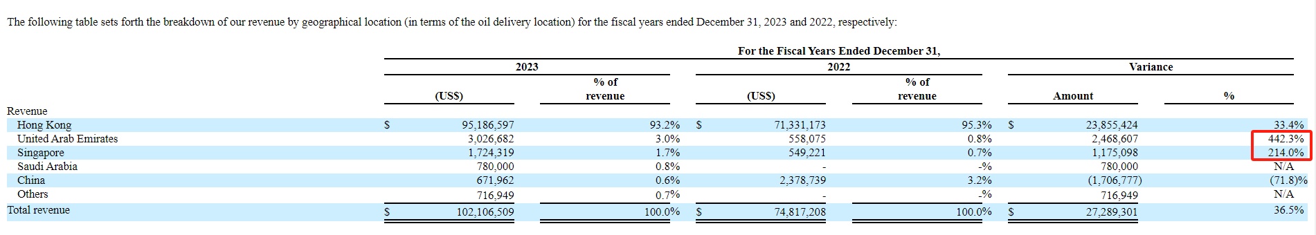 长安能源显然抓住了行业机遇,其于2023年中向更多的客户提供了船用燃油服务,销售量从2022年的98,013吨增加至约163,738吨,同比增长了67.06%。也正因如此,长安能源2023年的总收入增长36.5%至1.02亿美元,其中来自香港的收入增长33.4%至9518.66万美元。值得注意的是,总收入增速低于销量增长是因为2023年油价较2022年有所下降所致。