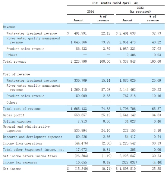 在过去的2022财年、2023财年(财政年度结束日期为每年10月31日)和2024财年前六个月(截至2024年4月30日),鼎信生态的收入分别为359.37万、944.73万和222.38万美元,相应的净利润分别为37.24万、185.96万和-1.58万美元。上半年净利转为亏损,显示出业绩层面存在较大的波动性。