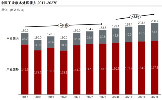 头豹研究院数据显示,2017-2023年,中国的工业废水处理能力由1.8亿吨/日增长至1.89亿吨/日,年复合增长率为0.8%。随着中国工业的发展和工业废水处理比率(已处理废水量与废水排放总量之比)的提升,预计未来工业废水的处理能力将会稳步增长,2024年中国工业废水处理能力有望达到1.93亿吨/日,预计到2028年中国的工业废水处理能力将达到2.08亿吨/日,2023-2027年均复合增长率为2.6%。