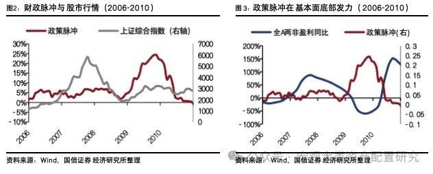 政策对股市的提振,正经历从“信用扩张”向“财政支出”的转变,“政策-估值-盈利”的三次确认传导,政策领先于行情,行情领先于盈利而幅度则跟随盈利确认。如果将政策脉冲定量拆分为支出、税收和信用三个部分,不难发现其对股市的提振正经历从“信用”向“财政支出”的转变,2008-2009、2019-2021的股市行情与信用端的相关性较强,与税收和支出端的相关性较弱,这与财政政策的目标切换密切相关。但进入2023年以来,股市对信用端的跟随有所弱化,与财政支出端相关性更强。从政策向股市的提振来看,一轮行情的爆发体现出“政策-估值-盈利”的三次传导,政策领先于行情通过一轮情绪提振来带动市场短期陡峭回升,政策红利带来的情绪退潮后股市震荡盘整,随后基本面盈利受益于政策逐步确认引发行情长期健康回暖,由此构成行情“三段论”。对2008-2009、2019-2021的复盘来看,政策脉冲的拐点领先于股市行情的拐点,领先期约为3个月,而盈利改善的拐点滞后于行情的发生,传导期间约1-2个季度。盈利改善确立后,往往能够带动新一轮行情的延续。