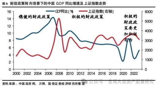 在经济低谷期,货币政策先行,财政政策接力货币政策,两相协同助力经济平稳过渡。在经济低谷期,市场主体普遍持有悲观的预期,居民和企业部门对消费和投资都更为谨慎,这会导致货币政策传导机制受阻,使得传统的货币宽松措施难以发挥应有的刺激作用,宽松的货币政策助力有限。宽松的货币政策可以为财政政策效力的发挥创造条件,通过增加公共支出或减少税收来刺激经济增长,从而扭转市场主体预期,带动新一轮的资本开支,财政政策的助力不可或缺。在宽松的货币政策环境下,财政政策接棒货币政策,两者的协同作用有助于经济体从低谷中复苏,为经济的稳定增长和市场的健康发展奠定基础。在次贷危机和新冠疫情后财政政策两度转向,助力经济快速复苏和市场回暖。本文通过回顾2000年至今政府工作报告中关于财政政策基调的表述,可以发现财政政策表现出了显著的相机抉择和逆周期性。2000年至今,财政政策有两次显著的转向:第一次是在2009年,受全球性金融危机的影响,国内经济基本面走弱,GDP增速同比大幅下降,在弱预期、弱现实的背景下,政府工作报告中财政政策基调由“稳健的财政政策”转变为“积极的财政政策”,此后“四万亿投资计划”及一系列减税降费政策陆续出台,我国经济也完成探底反转,迅速复苏。自2009年后,经济增速持续放缓步入“三期叠加”的特定阶段,在经济转型发展时期,积极的财政政策得以延续,财政政策更为聚焦,致力于改善民生和支持特定产业的发展。直到2020年,受新冠疫情的影响全球经济受到冲击,为应对疫情冲击,财政政策立即作出相应,财政政策基调再度发生变化,表现为“积极的财政政策要更加积极有为”。随着全国范围内复工复产的有序推进,以及财政政策的持续加码,我国成功地摆脱了疫情带来的不利影响,在全球经济普遍受挫的2020年,我国经济逆流而上,成为世界主要经济体中唯一在该年度实现经济正增长的主体。