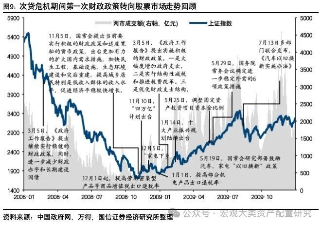 2008年11月5日,国常会提出当前要实行积极的财政政策和适度宽松的货币政策,以应对金融危机的挑战,标志着财政政策发生转向。会议同时确定了进一步扩大内需、促进经济增长的十项措施,其中涉及财政政策的措施主要是通过增加政府投资和基础设施建设来刺激经济,并提出四季度先增加安排中央投资1000亿元,次年灾后重建基金提前安排200亿元,带动地方和社会投资,总规模达到4000亿元。随后“四万亿投资计划”出台,资金的分配大致为:铁路、公路、机场、城乡电网建设约1.8万亿元;地震重灾区恢复重建约1万亿元;农村民生工程和基础设施约3700亿元;生态环境约2100亿元;保障性安居工程约2800亿元;自主创新和结构调整约1600亿元;医疗卫生、文化教育事业约400亿元。“四万亿投资计划”有效提振了市场情绪,股市也触底反弹,结束了持续下跌的行情。由于本轮金融危机对出口影响较大,因此后续的财政政策更多地聚焦于提振内需和帮助外向型企业渡过难关。对于外向型企业,主要是通过出台一系列的出口退税政策,降低外向型企业的税负,从而助力这些企业渡过难关,自2008年下半年起,我国陆续出台了针对劳动密集型产品、机电产品、轻工产品等的出口退税政策,有效地促进了外贸企业的平稳发展。在提振内需方面,2009年1月之后,十大产业振兴规划陆续出台,通过财政发力稳定这些产业,有效地保障了税收、就业和“三农”问题稳定,股市也就此开始迎来了新一轮的上涨行情,随后“家电下乡”“汽车下乡”“以旧换新”等内需增量政策陆续落地带动家电和汽车销量大幅上涨,相关板块个股也受益于此大幅上涨。在这一轮股市反弹行情中,财政政策的强力托底带动经济快速复苏,行业基本面预期改善推动股市V型反转,从股市的走势上看,“四万亿”等政策发布的初期,市场情绪得到改善,股市估值迅速修复,随着政策的持续发力,经济和上市公司的基本面也在数据上得到验证,这进一步推动了股市的持续攀升,巩固了其V型反转的势头。