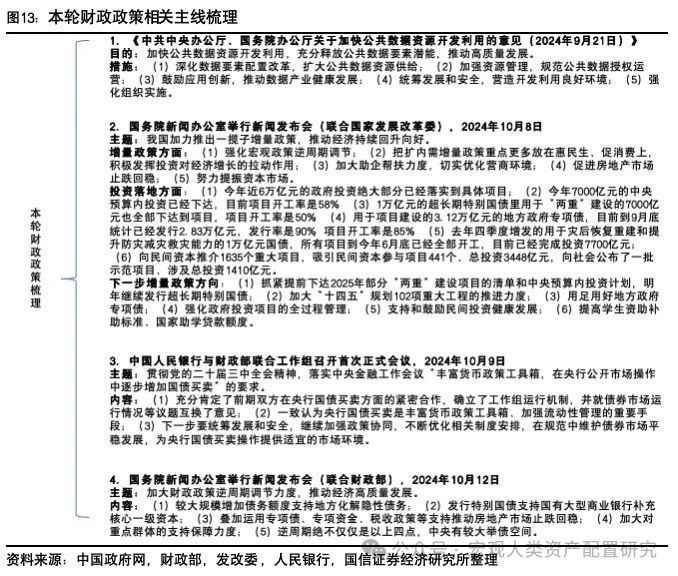 当前股市更多受益于政策密集红利下情绪提振,行情持续健康发展、后续节奏延续等,仍有赖于财政支出的力度及其对基本面的提振作用。在政策主线逐步明确的当下,前期高弹性的上涨难以复刻,跟随政策利好和基本面改善的稳步上涨或将出现。从资金投向看,本轮财政刺激的支出方向集中在化债、房地产和重点群体的保障,同时提振民生和消费领域。此外,财政政策对民间投资的关注也值得期待,营商环境的改善能够带动整体投资的发展。
