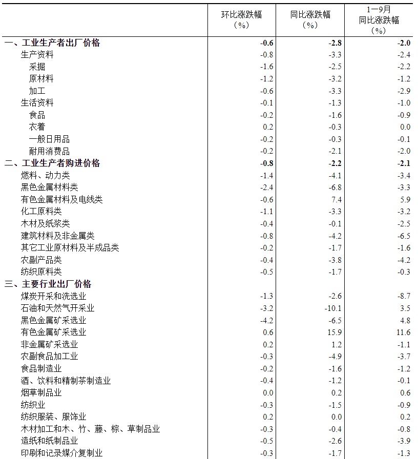 2024年9月份,全国工业生产者出厂价格同比下降2.8%,环比下降0.6%;工业生产者购进价格同比下降2.2%,环比下降0.8%。1—9月平均,工业生产者出厂价格比上年同期下降2.0%,工业生产者购进价格下降2.1%。