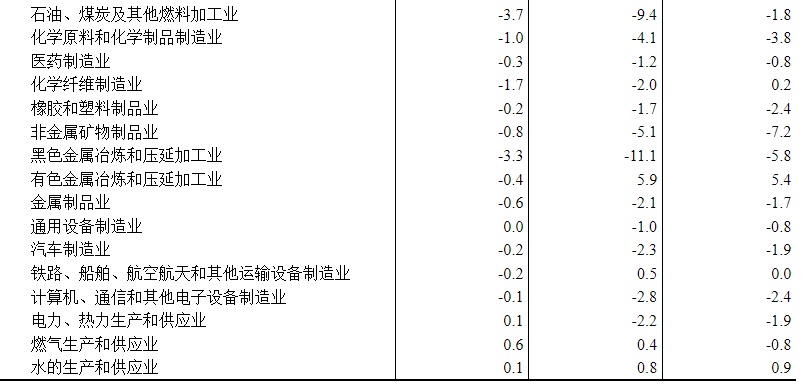 工业生产者购进价格中,黑色金属材料类价格下降2.4%,燃料动力类价格下降1.4%,化工原料类价格下降1.1%,建筑材料及非金属类价格下降0.8%,有色金属材料及电线类价格下降0.6%,纺织原料类价格下降0.5%,农副产品类价格下降0.4%。