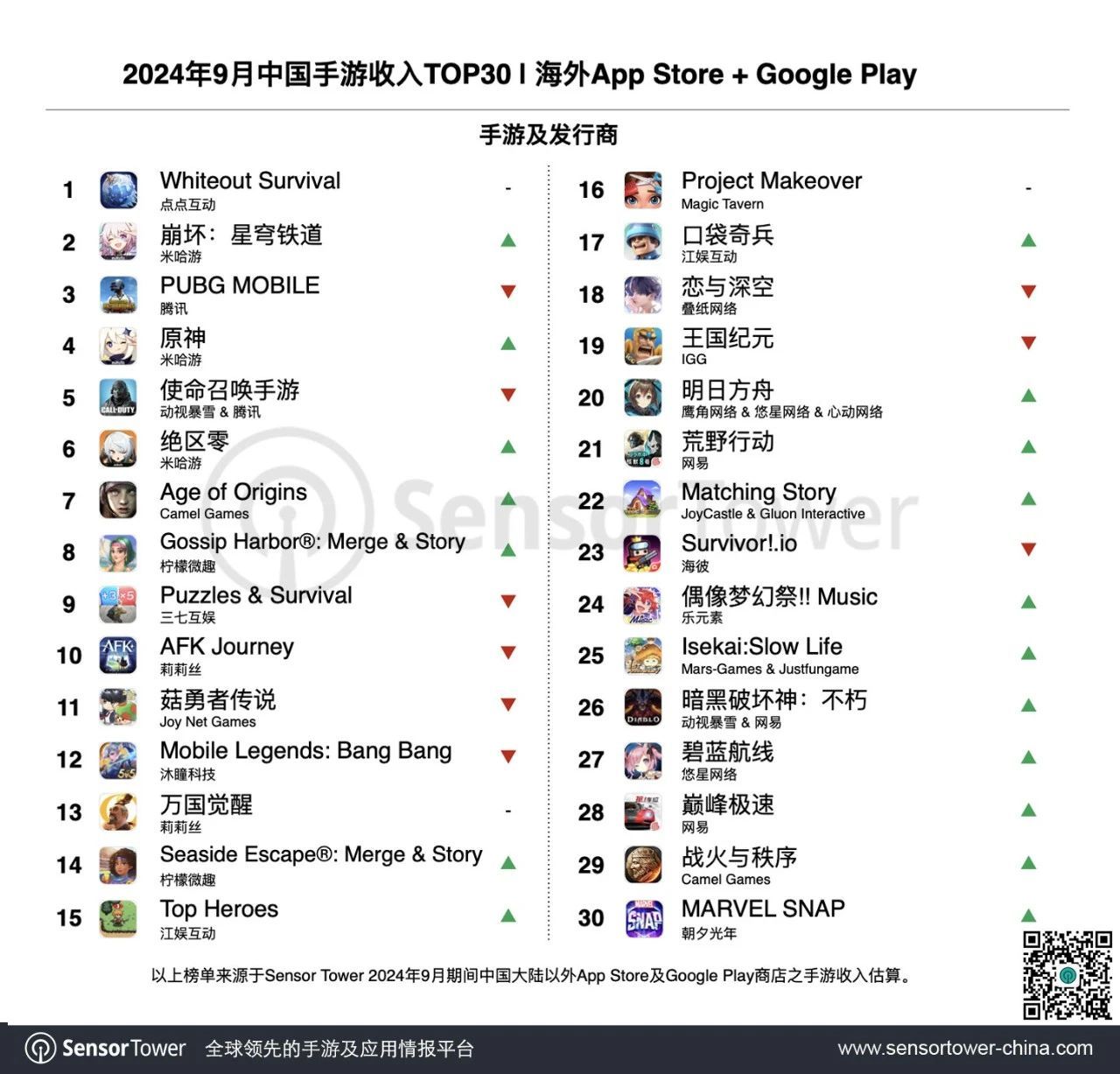 点点互动冰雪末日题材4X策略手游《Whiteout Survival 无尽冬日》稳居出海手游收入榜首。9月中下旬,《Whiteout Survival》迎来全球下载量突破9000万的里程碑时刻,在“90 Million Milestone”、“Full Moon 2024”和“Frostdragon Tyrant”等活动的带动下,该游戏海外收入环比增长7%,再次刷新历史记录。加之在中国iOS市场的强势增长,截至9月底《Whiteout Survival》全球累计收入已突破13亿美元。