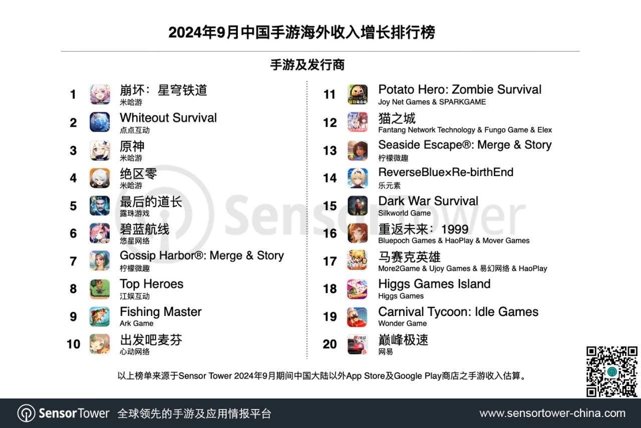 9月出海手游收入增长榜