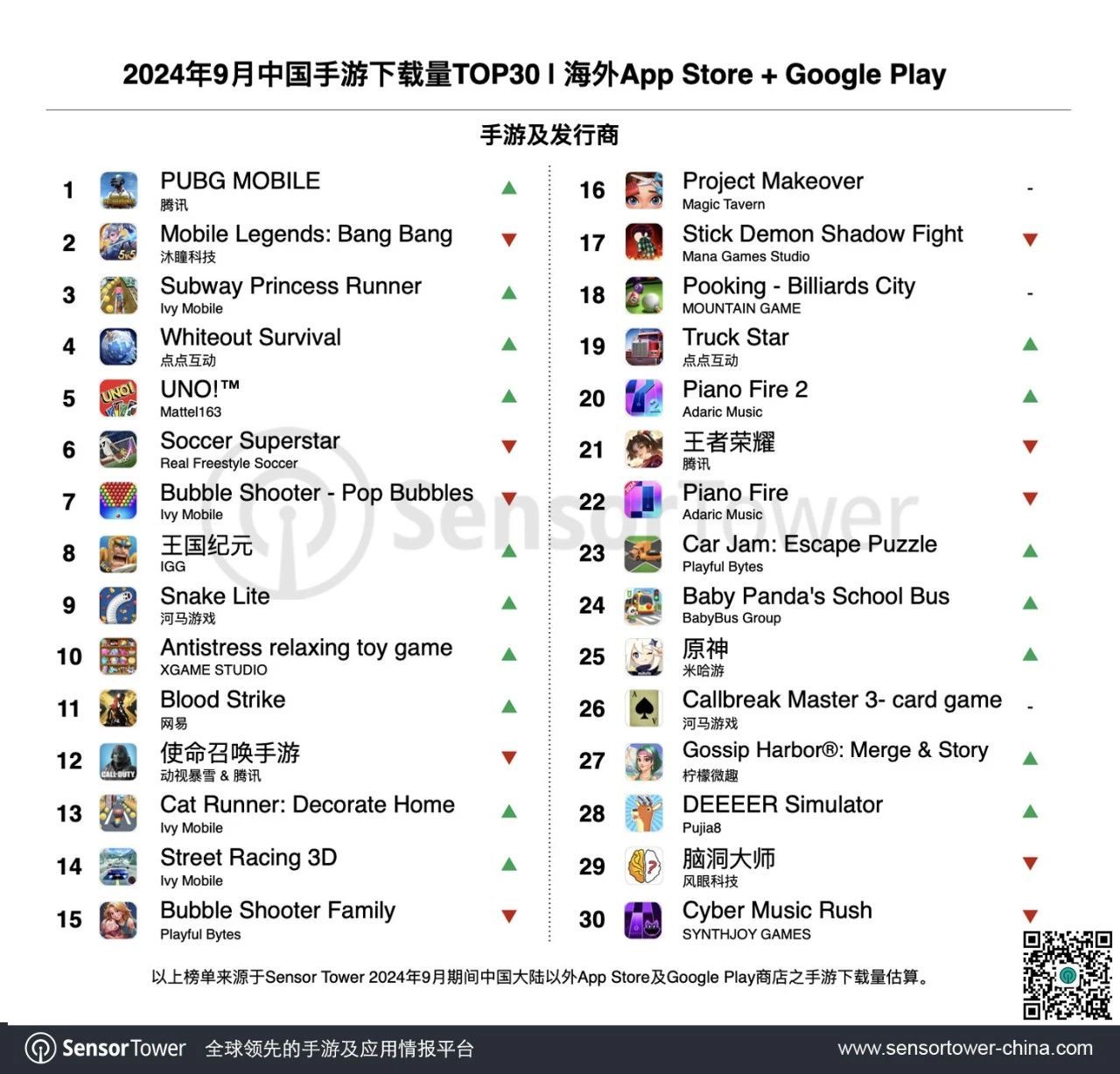 腾讯《PUBG MOBILE》9月下载量表现稳定,排名上升1位,重回下载榜冠军宝座。
