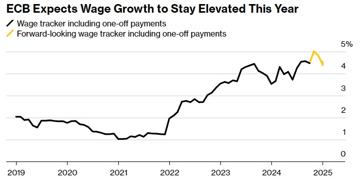 欧洲央行假设,2025年下半年将持续达到2%的通胀目标,这是基于工资增长放缓;但它也不希望劳动力市场和薪酬增长放缓太多。
