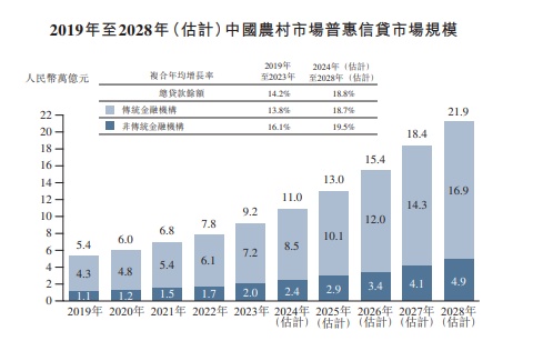 近年以来,为缓解城乡发展不平衡、金融服务不充分问题,普惠金融以及乡村振兴已成为中国金融发展重要战略方向和实践领域之一,助农也就成为了金融服务业的发展重点。根据弗若斯特沙利文报告,预计农村普惠信贷市场规模将不断增长,于2028年达到人民币21.9万亿元,2024年至2028年的复合年均增长率为18.8%。