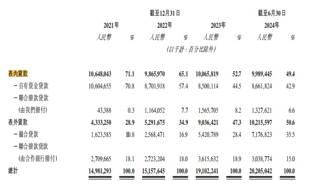 招股书数据显示,2023年之前,表内贷款一直为中和农信在贷余额的主要生力军,2021至2023年,公司表内贷款在贷余额分别为106.48亿元、98.66亿元和100.66亿元,占比分别为71.1%、65.1%、52.7%,但到了2024年上半年,其表内贷款余额降至99.89亿元,占总在贷余额比重降至50%以下,仅为49.4%。