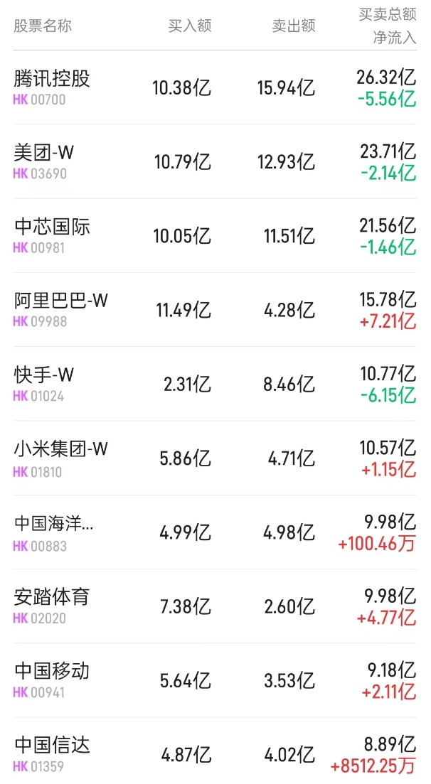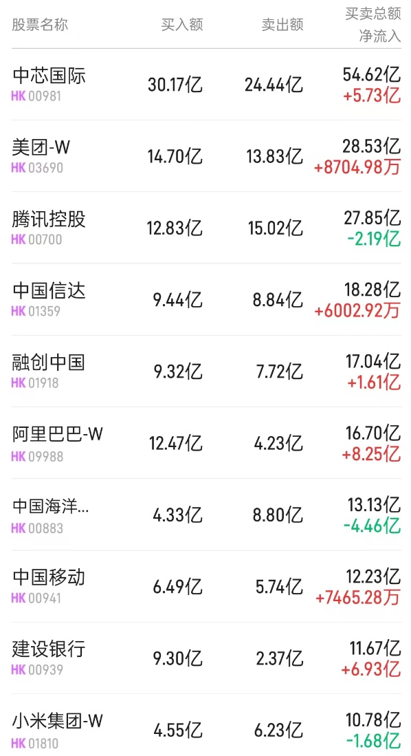 中芯国际(00981)获净买入4.26亿港元。消息面上,10月11日晚,中芯国际发布公告,易方达上证科创板50ETF增持公司境内股票961.62万股,增持比例为0.48%。本次增持后,易方达上证科创板50ETF持有中芯国际境内股票约1.087亿股,占公司境内总股本的比例为5.47%,占公司总股本的比例为1.36%。