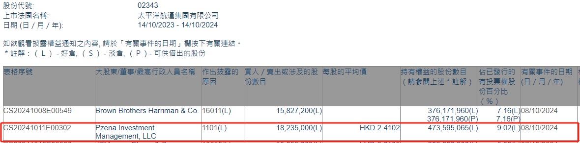 智通财经APP获悉,香港联交所最新资料显示,10月8日,Pzena Investment Management,LLC增持太平洋航运(02343)1823.5万股,每股作价2.4102港元,总金额约4395万港元。增持后最新持股数目约4.74亿股,最新持股比例为9.02%。