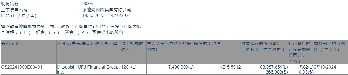 智通财经APP获悉,香港联交所最新资料显示,10月7日,三菱日联金融集团减持维他奶国际(00345)740万股,每股作价5.5912港元,总金额约4137.49万港元。减持后最新持股数目约8398.79万股,最新持股比例7.82%。