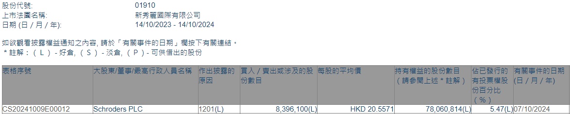 智通财经APP获悉,香港联交所最新资料显示,10月7日,施罗德减持新秀丽(01910)839.61万股,每股作价20.5571港元,总金额约为1.73亿港元。减持后最新持股数目约为7806.08万股,最新持股比例为5.47%。