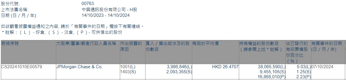 智通财经APP获悉,香港联交所最新资料显示,10月7日,小摩增持中兴通讯(00763)398.6846万股,每股作价26.4707港元,总金额约为1.06亿港元。增持后最新持股数目约为3806.56万股,最新持股比例为5.03%。