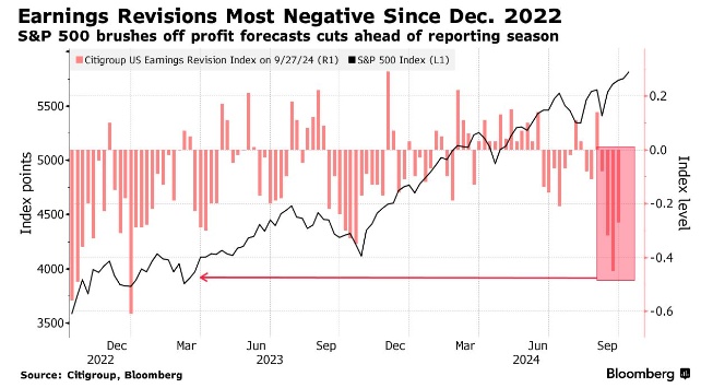 与此同时,花旗9月份的盈利修正指数显示出强劲的负面势头,跌至2022年12月以来的最低水平。尽管分析师忧心忡忡,但标普500指数上周五还是再创新高,2024年以来累计上涨22%,创下1997年以来的最佳开年纪录。