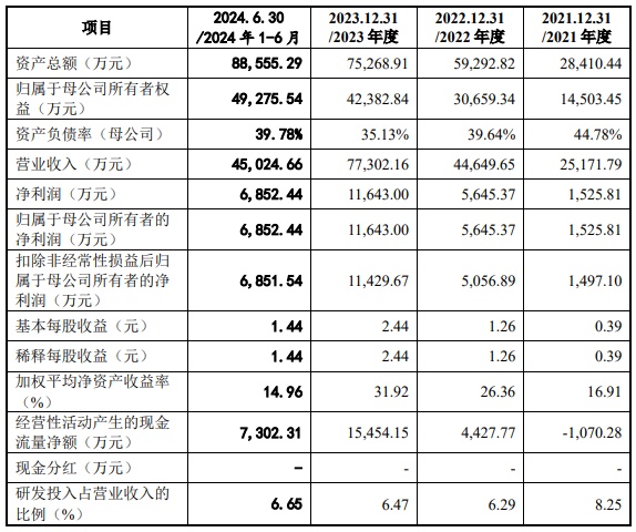 财务方面,于2021年度、2022年度、2023年度以及2024年1-6月,弘景光电实现营业收入分别约为2.52亿元、4.46亿元、7.73亿元以及4.50亿元。同期,该公司实现净利润分别约为1525.81万元、5645.37万元、1.16亿元以及6852.44万元。