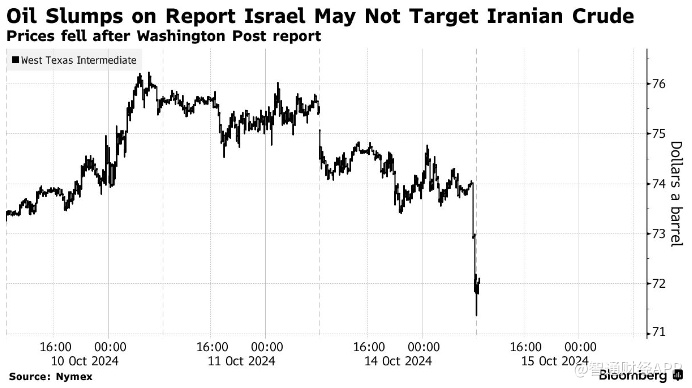 智通财经APP获悉,有报道称,以色列可能会避免袭击伊朗的原油基础设施,这缓解了人们对中东紧张局势的担忧,油价延续跌势。WTI原油周一下跌2.3%,至每桶72美元左右,布伦特原油日内跌幅达4.0%,收于每桶77美元附近。