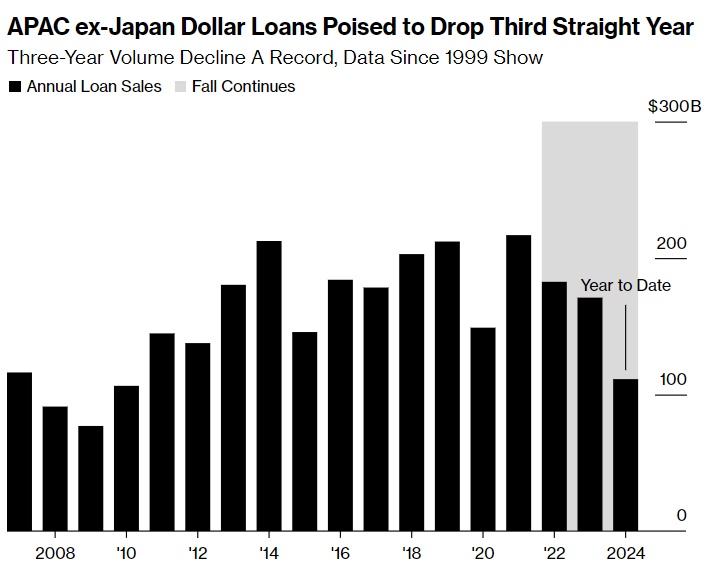 智通财经获悉,除日本外,亚太地区美元贷款规模预计将连续第三年下降,原因是未来几个月预计将没有大额交易,这与此前的增长预期相左。根据机构汇编的自1999年以来的数据,今年迄今为止,借款人筹集了超过1110亿美元的美元贷款,不包括双边贷款,比2023年同期下降了16%。如果这一趋势在今年剩余时间内持续下去,这将是该地区首次出现连续三年销量下滑的情况。