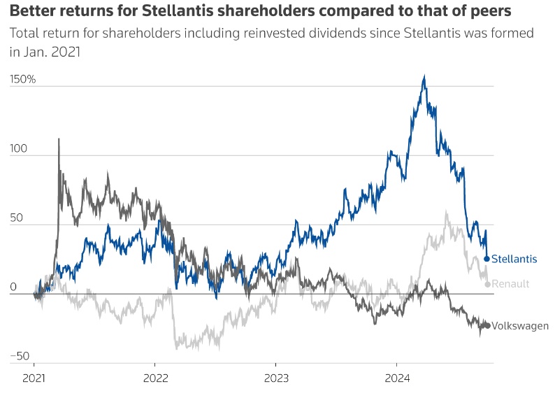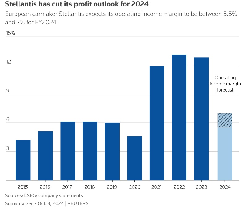 全球第四大汽车制造商Stellantis股价今年已下跌近45%,部分原因是9月底发布的盈利预警,这一警告震惊了那些习惯于高利润率(得益于美国皮卡和吉普车的丰厚销售)的投资者。