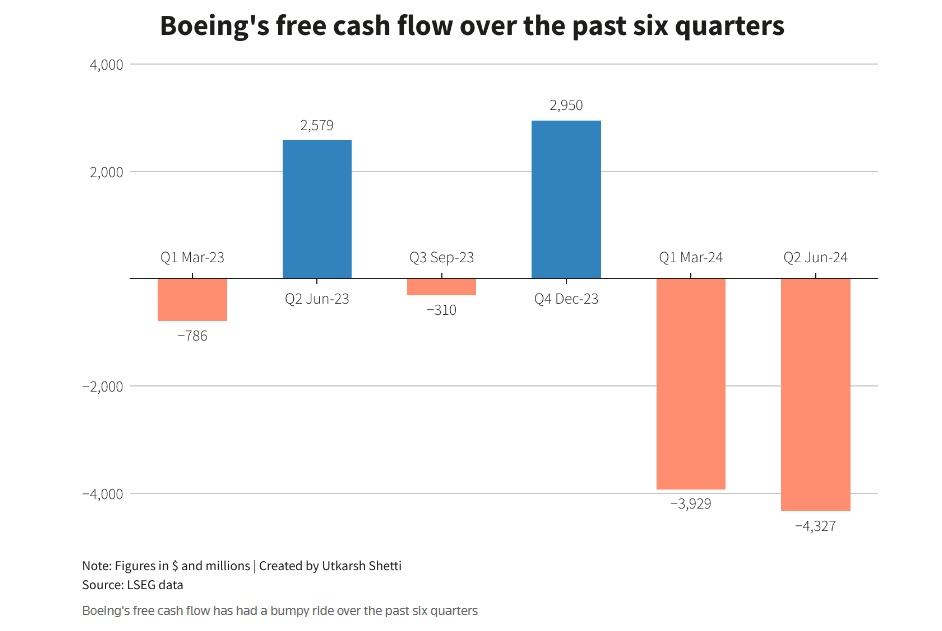 波音公司的自由现金流在过去六个季度中经历坎坷