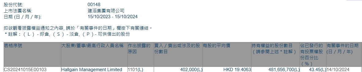 智通财经APP获悉,香港联交所最新资料显示,10月14日,Hallgain Management Limited增持建滔集团(00148)40.2万股,每股作价19.4063港元,总金额约为780.13万港元。增持后最新持股数目约为4.82亿股,最新持股比例为43.45%。