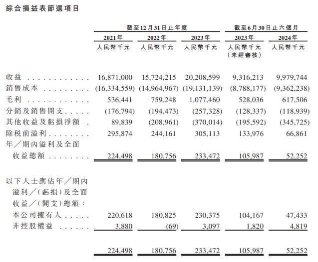 财务方面,于2021年、2022年、2023年截至12月31日止年度及2023年、2024年截至6月30日止六个月,梦金园的收入分别为168.71亿元、157.24亿元、202.09亿元及93.16亿元、99.8亿元人民币;同期,实现年内溢利分别为2.24亿元、1.81亿元、2.33亿元及1.06亿元、5225.2万元人民币。