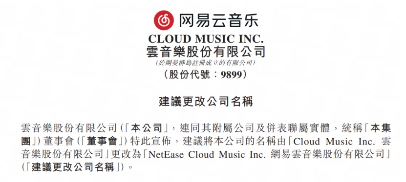 智通财经APP获悉,10月15日,网易云音乐在香港的上市主体云音乐股份有限公司(09899)发布公告,董事会建议将该公司名称由“Cloud Music Inc.云音乐股份有限公司”更改为“NetEase Cloud Music Inc.网易云音乐股份有限公司”。公告称,变更后公司名称将与其标志性产品网易云音乐保持一致,有助于资本市场更好识别本公司并更快捷地获取相关交易资料,及加强公司整体品牌,为股东创造长期价值,符合公司及股东的整体最佳利益。