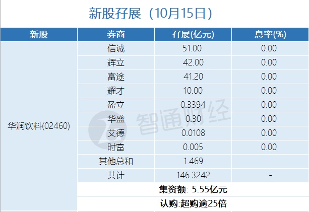 智通财经APP获悉,华润饮料(02460)正在招股中。截止10月15日,富途、辉立、耀才等券商合计为华润饮料借出146.3242亿港元,超购逾25倍。