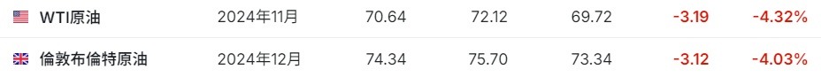3. 截至发稿,WTI原油跌4.32%,报70.64美元/桶。布伦特原油跌4.03%,报74.34美元/桶。