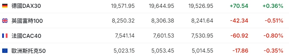 2. 截至发稿,德国DAX指数涨0.36%,英国富时100指数跌0.51%,法国CAC40指数跌0.80%,欧洲斯托克50指数跌0.35%。