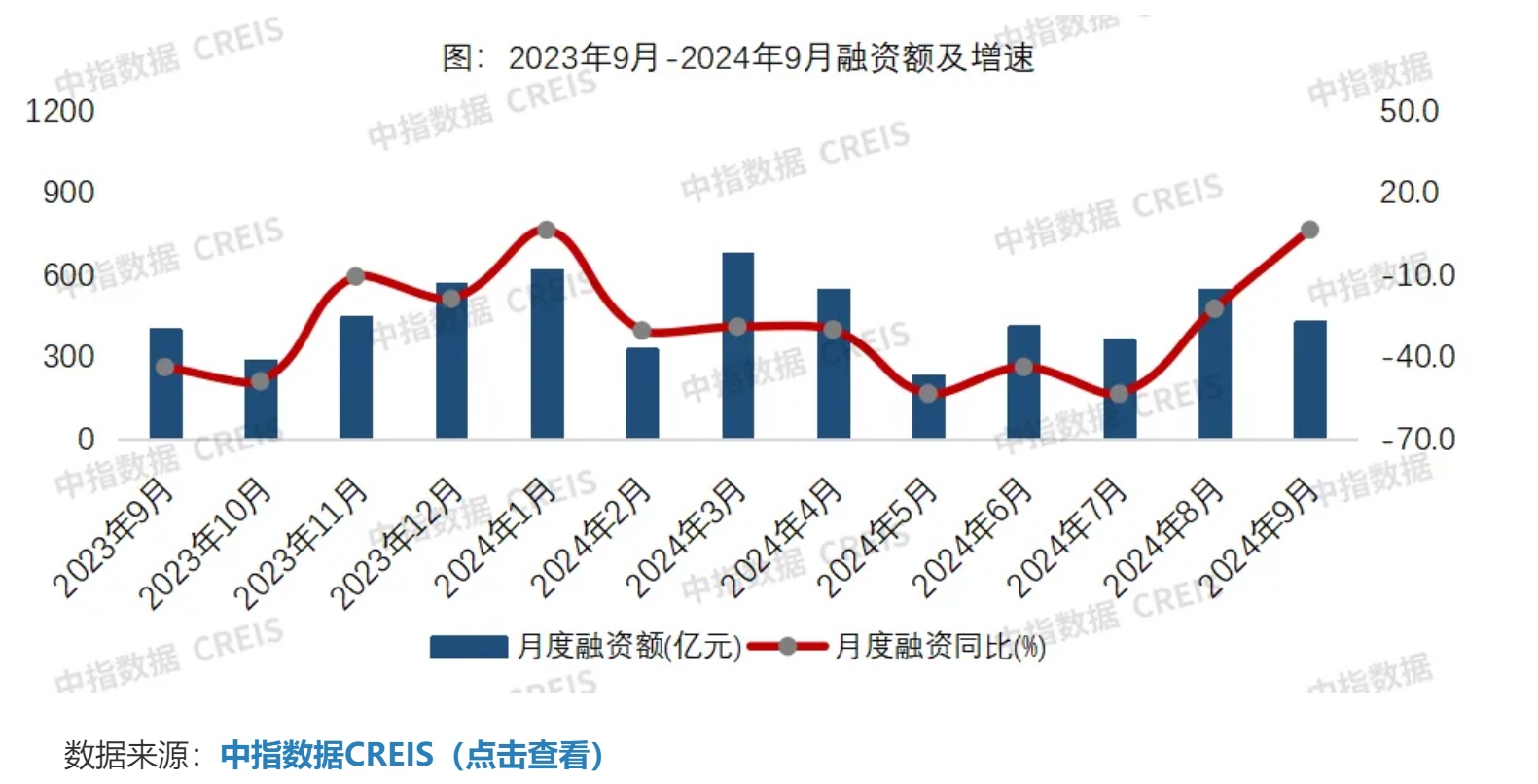 智通财经APP获悉,中指研究院监测,2024年9月房地产企业债券融资总额为428.3亿元,同比增长8.0%,上年低基数影响下同比转正,环比下降22%。行业债券融资平均利率为3.06%,同比下降0.62个百分点,环比增加0.53个百分点。