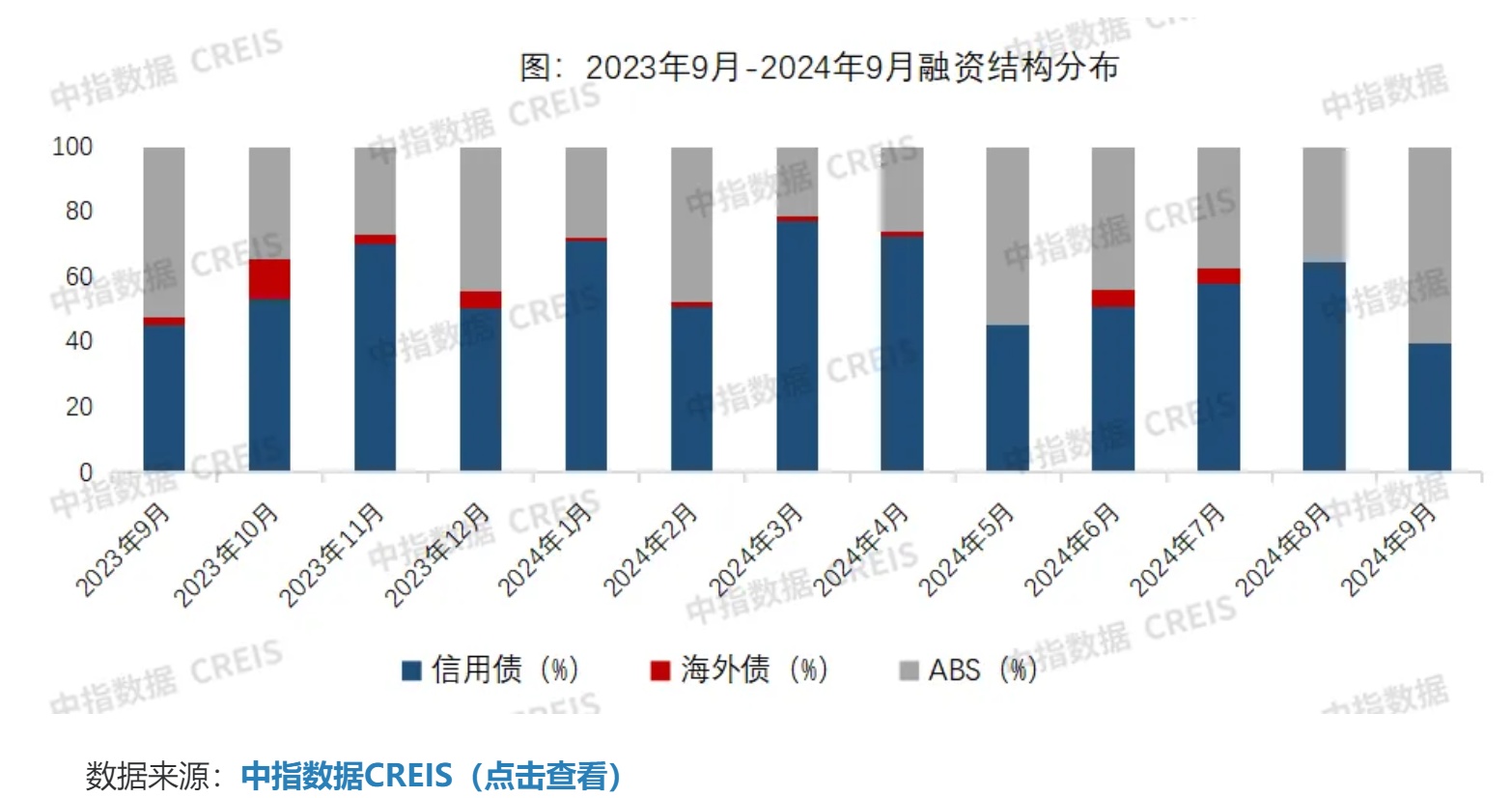 从融资结构来看,9月,房地产行业信用债融资169.9亿元,同比下降5.1%,环比下降52.1%,占比39.7%;ABS融资258.4亿元,同比增长24.0%,环比增长33.1%,占比60.3%。