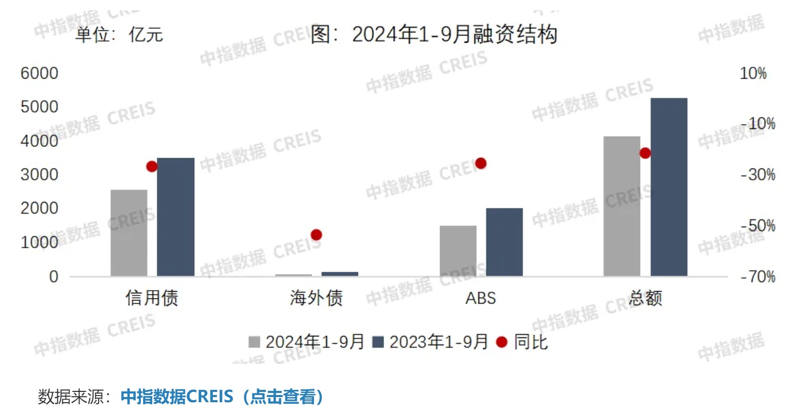 2024年1-9月,房地产行业债券融资总额4130.2亿元,同比下降27.0%,降幅较上月有所收窄。其中,信用债融资2561.1亿元,同比下降26.8%,占比62.0%;海外债发行金额67.0亿元,同比下降53.7%,占比1.6%;ABS融资1502.2亿元,同比下降25.5%,占比36.4%。