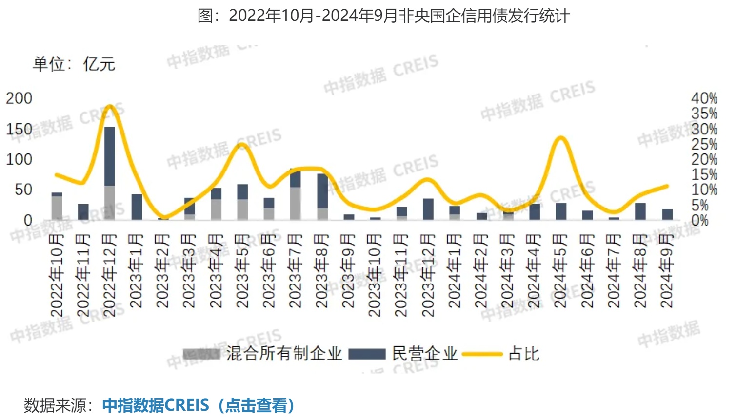 9月信用债发行总量较上月下滑,因上月基数较高,民营房企发债规模和范围有所减少,滨江、美的置业月内发行3笔信用债,合计规模19亿元,但在信用债发行总额的占比有所上升,较上年提升2.9个百分点。月内保利发展、华发股份等央国企仍积极发行信用债,分别为20亿元、8.9亿元。本月公司债较上月发行规模增加,占信用债发行总额的56.5%,3年以上债券占比达到58.8%,带动月内信用债平均发行年限延长。