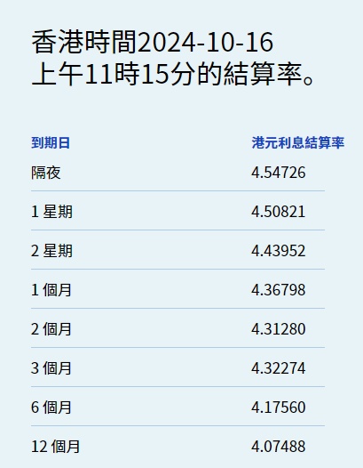反映银行资金成本的三个月拆息降至4.32274%。长息方面,六个月期及一年期分别跌至4.1756%和4.07488%。