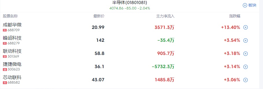 半导体芯片板块持续走低,润欣科技、世运电路等跌超7%。