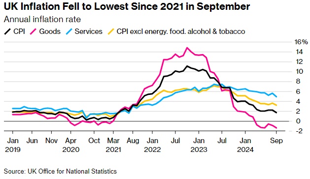 智通财经APP注意到,英国通胀率三年半来首次跌破英国央行 2% 的目标,为下个月第二次降息奠定了基础。统计局公布的数据显示,英国9月份CPI同比上涨 1.7%,低于前值的 2.2%。这一数字低于经济学家预期的 1.9% 和英国央行 8 月份预测的 2.1%。