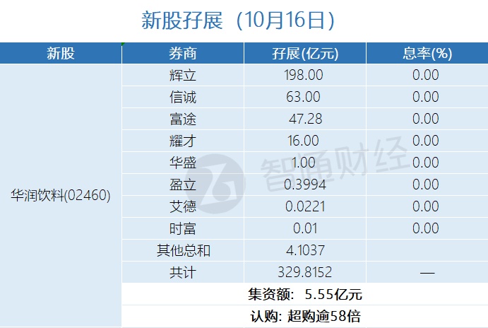 智通财经APP获悉,华润饮料(02460)正在招股中。截止10月16日,富途、辉立、耀才等券商合计为华润饮料借出329.8152亿港元,超购逾58倍。