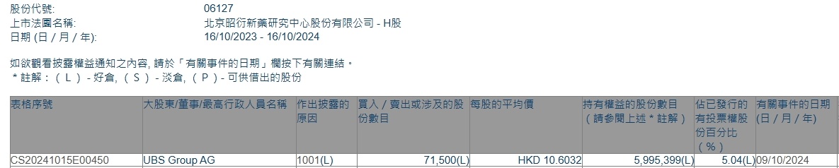 智通财经APP获悉,香港联交所最新资料显示,10月9日,瑞银增持昭衍新药(06127)7.15万股,平均每股作价为10.6032港元,总金额约为75.81万港元。增持后最新持股数目约为599.54万股,持股比例为5.04%。