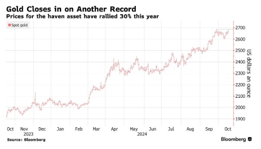 数据显示,现货黄金一度上涨0.8%,至每盎司2682.39美元,接近上月创下的2685.58美元的历史纪录。今年迄今为止,金价上涨了约30%。
