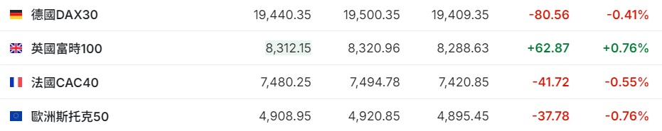 2. 截至发稿,德国DAX指数跌0.41%,英国富时100指数涨0.76%,法国CAC40指数跌0.55%,欧洲斯托克50指数跌0.76%。