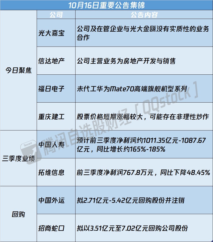 1、中国人寿:预计前三季度净利润约1011.35亿元-1087.67亿元,同比增长约165%-185%