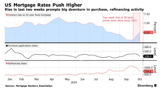 根据美国抵押贷款银行家协会(MBA)周三公布的数据,截至10月11日当周,30年期固定利率抵押贷款的合同利率上涨16个基点,至6.52%。在过去的两周里,这一利率攀升了38个基点,是自2023年2月以来任何可比时期的最高水平。