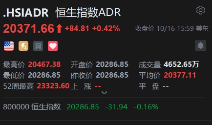 智通财经APP获悉,周三美股三大指数集体上涨,恒生指数ADR上涨,按比例计算,收报20371.66点,较香港收市上涨84.81点或0.42%。