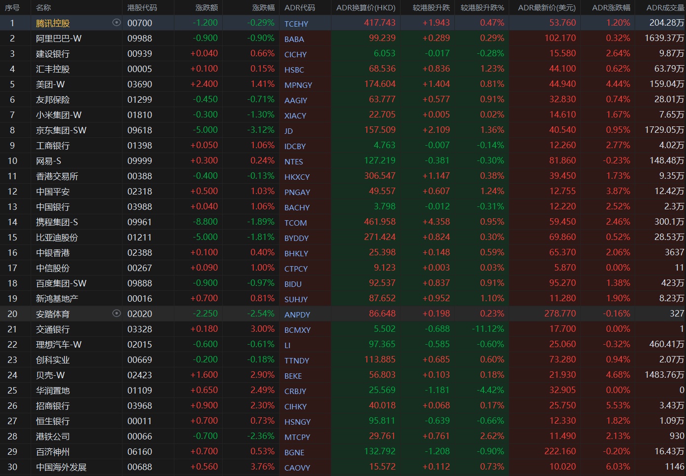 大型蓝筹股涨跌不一,汇丰控股收报68.536港元,较香港收市涨1.23%;腾讯控股收报417.743港元,较香港收市涨0.47%。
