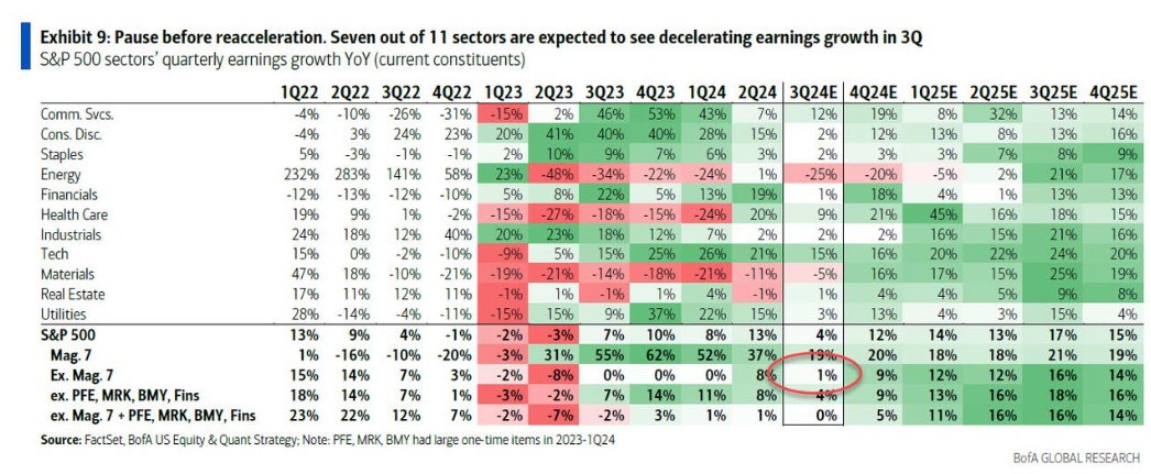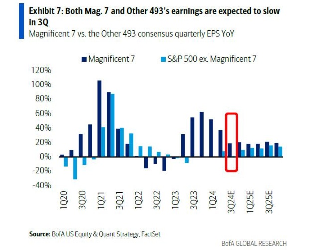 周三,根据美国银行的数据,虽然预计美股第三季度整体收益增长将达到 4%,但这完全归功于 Mag 7 收益增长19%(低于第二季度的37%、一年前的55%),标普500指数中的其余公司(约493家公司)预计将三季度收益预计再度持平!