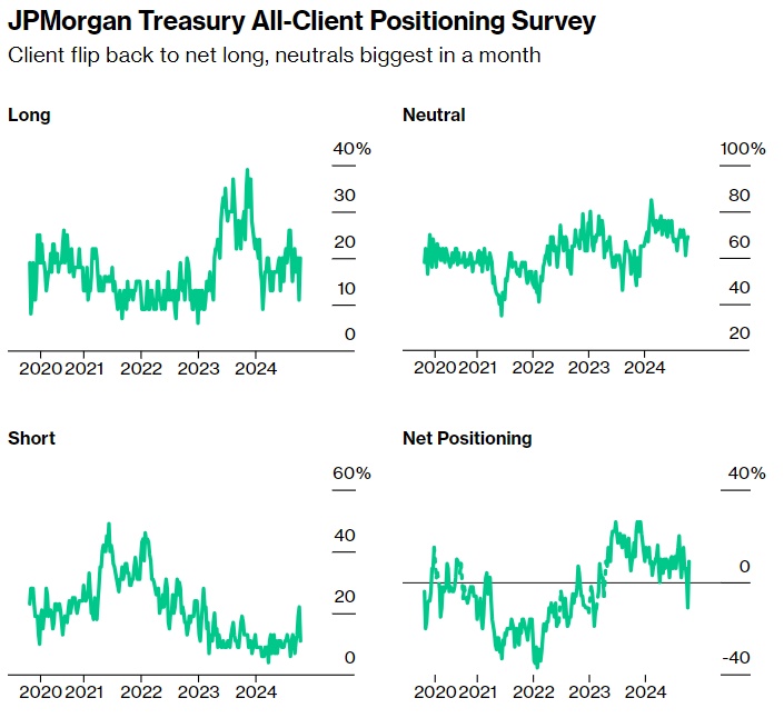 截至10月15日的一周,摩根大通对客户美国国债头寸的调查显示,净多头上升了9个百分点,达到五周以来的最高水平。与此同时,中性头寸上涨2个百分点,空头头寸下跌11个百分点。